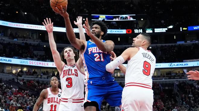 NBA常规赛公牛VS76人,吉迪防守恩比德